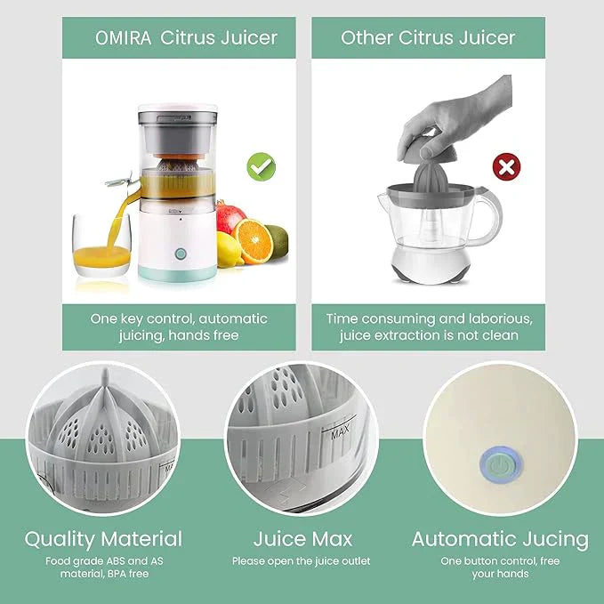 - 🍐 PORTABLE MIGHTY JUICER, GETS EVERY LAST DROP, EVERY TIME: The OMIRA Juice Vortex is the Ultimate Portable Juicer that can be carried anywhere in your bag for any outdoor adventure! This USB-C Rechargeable Electric Citrus Juicer is powerful enough to last numerous juicing sessions. The one-size fits all design works with oranges, apples, pears, grapes, lemons, watermelon, and even pomegranates.