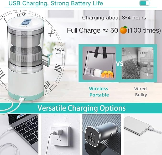 - 🍊 High Efficiency Juicing 🔄: Experience 360-degree omnidirectional three-dimensional juice extraction with superior efficiency and effective separation of pulp. This juicer meets all your juicing needs. It's USB rechargeable, cordless, and portable, allowing you to enjoy fresh juices anytime, anywhere, with confidence. 🥤🔋